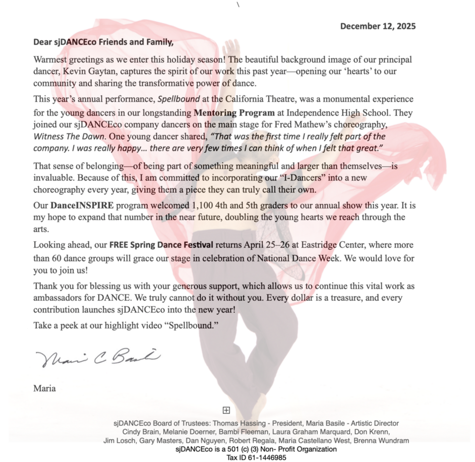 Thank you to all of our Donors who help keep Modern Dance alive in San Jose! We could not do it without you.